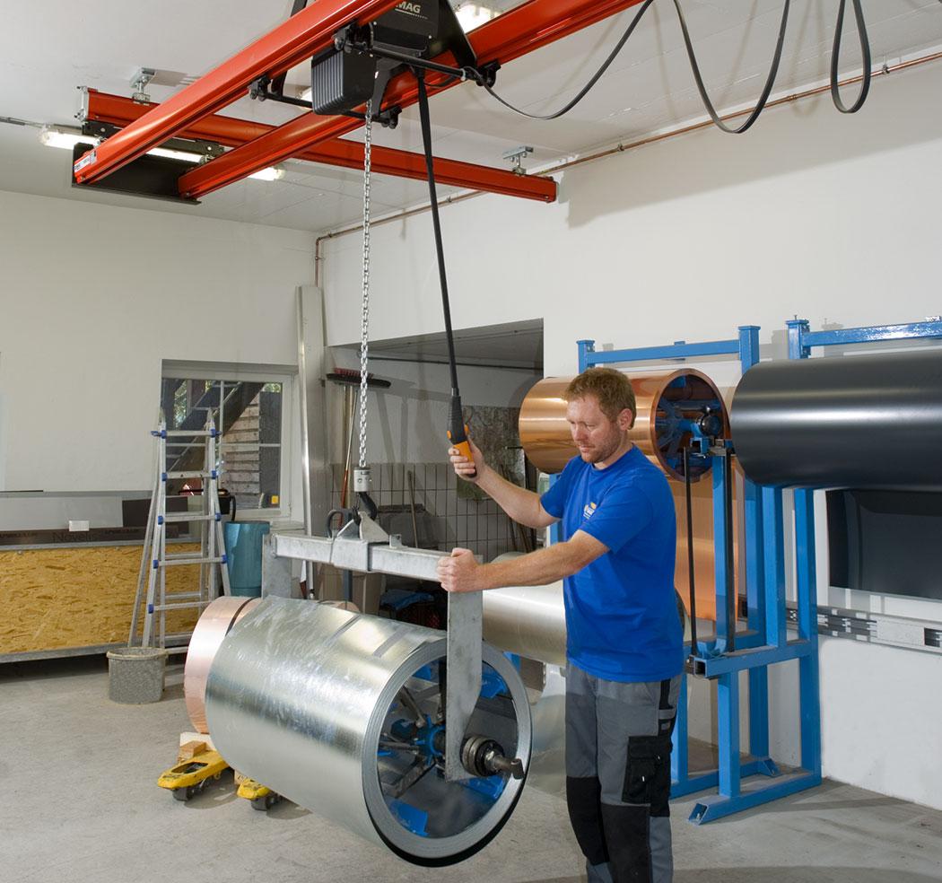 Single-girder suspension cranes are used to transport all kinds of materials, fast, reliable, surface covering, floor-free and accurate. Single-girder light crane systems can be easily suspended from the rafter or against a concrete ceiling from various suspension points. Additional columns for the crane track are not necessary. In this way, all parts of a hall can be optimally utilized technically and financially. Simple and safe operation due to the low weight and the smooth-running undercarriage. This makes it easy to move the cranes by hand.